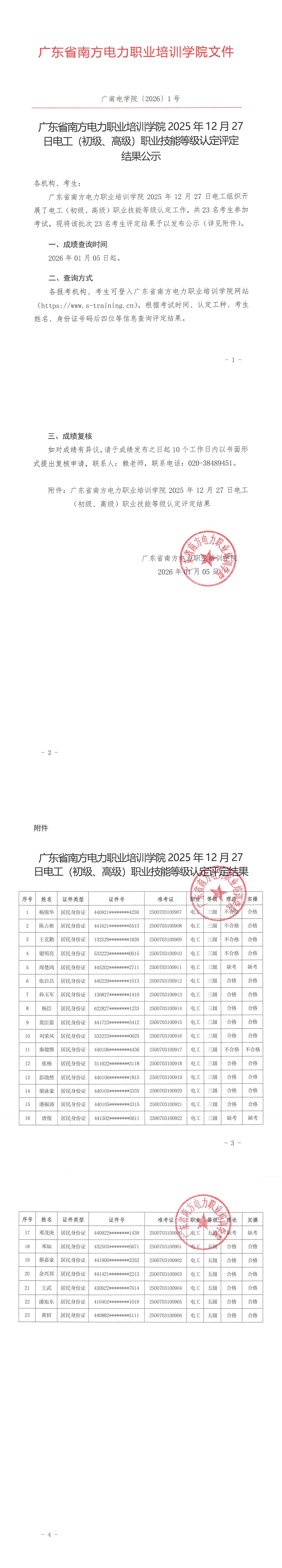 广东省南方电力职业培训学院2025年12月27日电工(初级、高级)职业技能等级认定评定结果公示